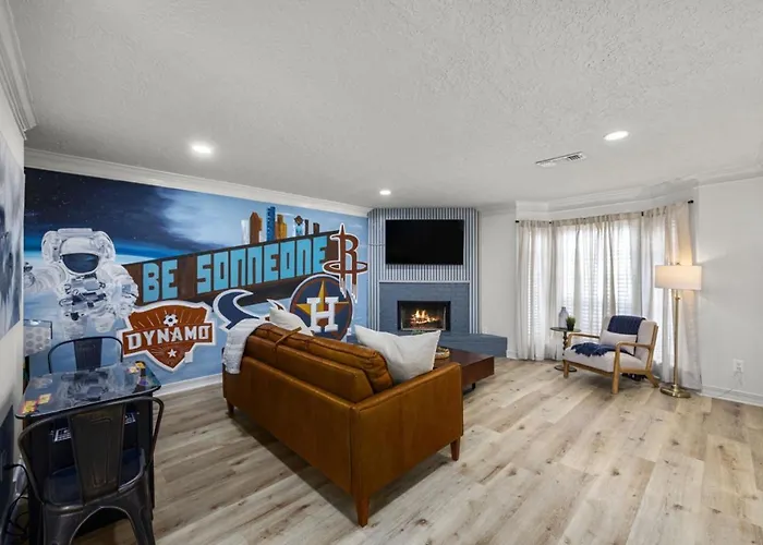 Das Walkable Montrose 2Br Houston Mural Sleeps 9 präsentiert sich als ideale Unterkunft für Reisende, die Komfort und kreative Atmosphäre suchen. Die künstlerisch gestaltete Umgebung, gepaart mit modernen Annehmlichkeiten, schafft eine einladende Umgebung für Familien und Gruppen.